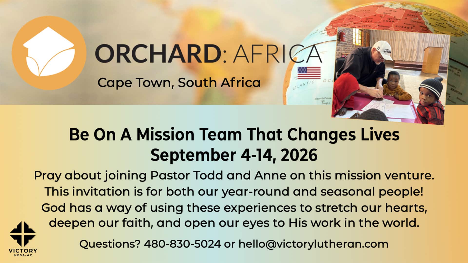 For 15 years, Victory has been blessed to partner with Orchard: Africa, a Christ-centered ministry that exists to equip the church to care for the vulnerable. Through local churches and pastors already serving in under-resourced communities, Orchard brings practical help and the hope of Christ to people in both rural and urban South Africa. Their work focuses on Food & Agriculture, Care, Education, and Ministry. The church is the platform, the programs are the tools, and hope in Christ is the message.