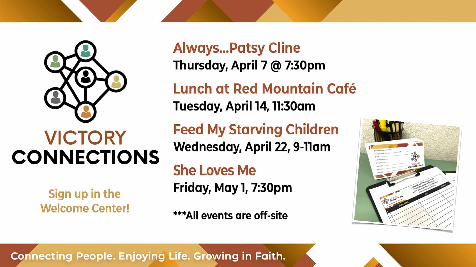 Feed My Starving Children (Off-Site)9:00-11:00am (Bus leaves at 8:00am)1100 W. Grove Parkway, TempeThis monthly mission trip to the Christian based, non-profit organization, is on the 4th Wednesday of each month....