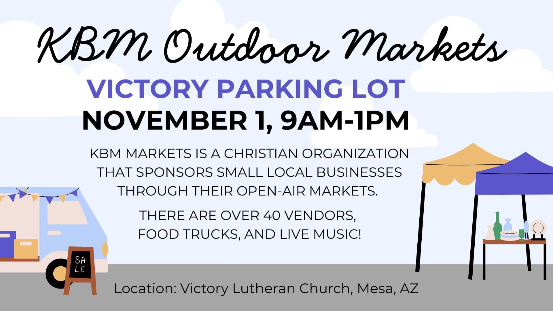 KBM Markets - Victory Parking LotKBM Markets is a Christian organization that sponsors small local businesses through their open-air markets. There are over 40 vendors (and growing!), food trucks, and live music. KBM Markets will host their 2025/2026 events in Victory’s parking lot on Saturdays (1-2 times per month) from 9am to 1pm. Victory will have...